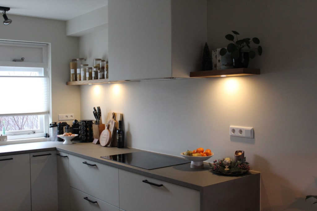 Op locatie heb ik de afzuigkap met kanaal afgewerkt met gipsplaten en een mdf plaat aangebracht tegen de onderkant van de afzuigkap. Daarna alles vlak afgewerkt, geschuurd, behangen en gesausd. Ook heb ik 2 mooie eikenhouten planken met de spotjes gemonteerd en geïnstalleerd.