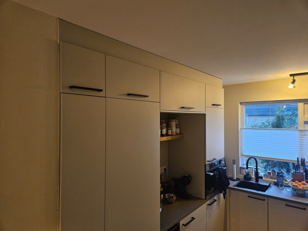 De bovenkant van de kasten, aan de andere zijde van de keuken, heb ik afgewerkt met plinten tot aan het plafond.