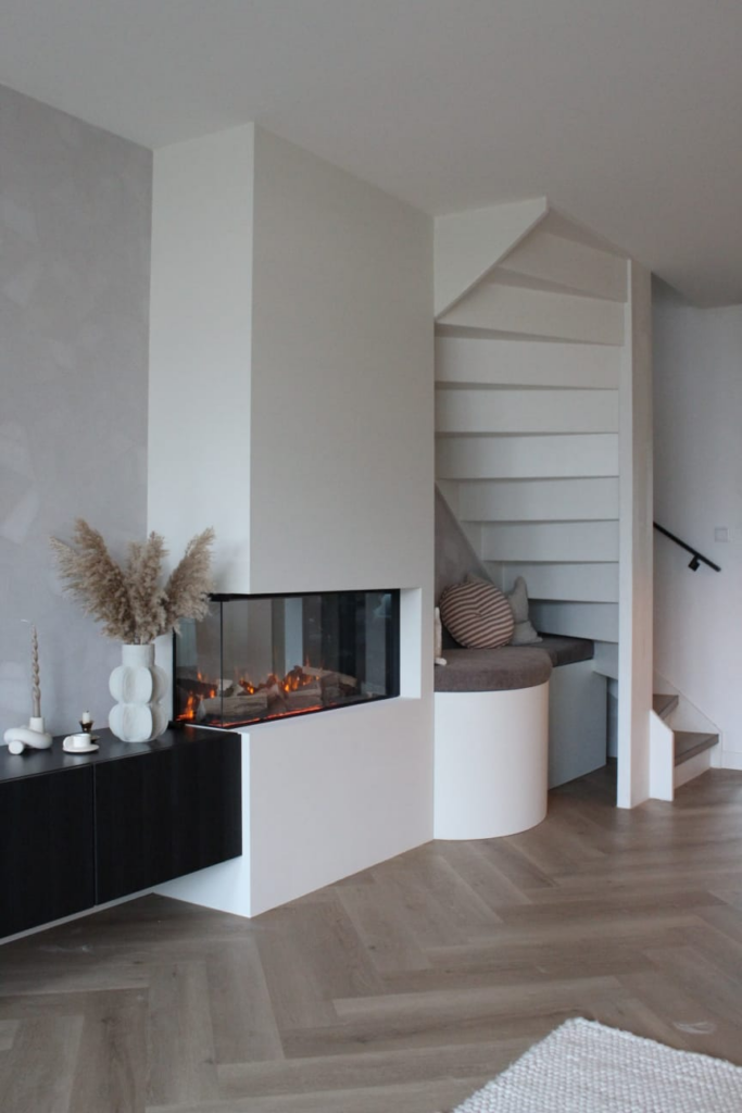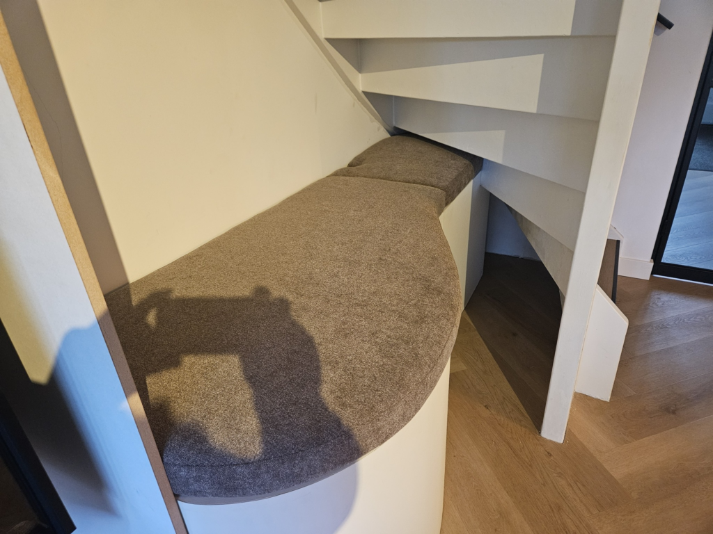 Ze wilden, ter afwerking van de vloerverwarmingsunit onder de trap in hun woonkamer, graag een bankje in een organische vorm en daarnaast een ombouwde elektrische haard.
